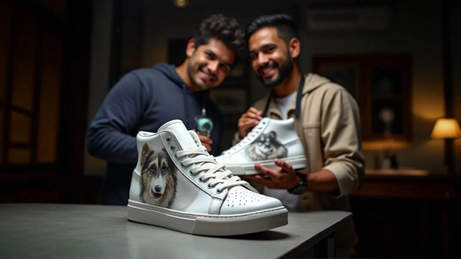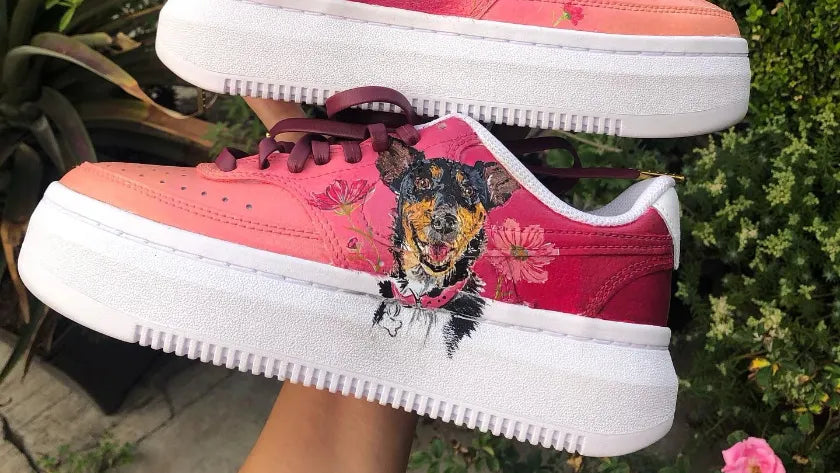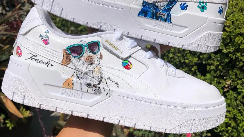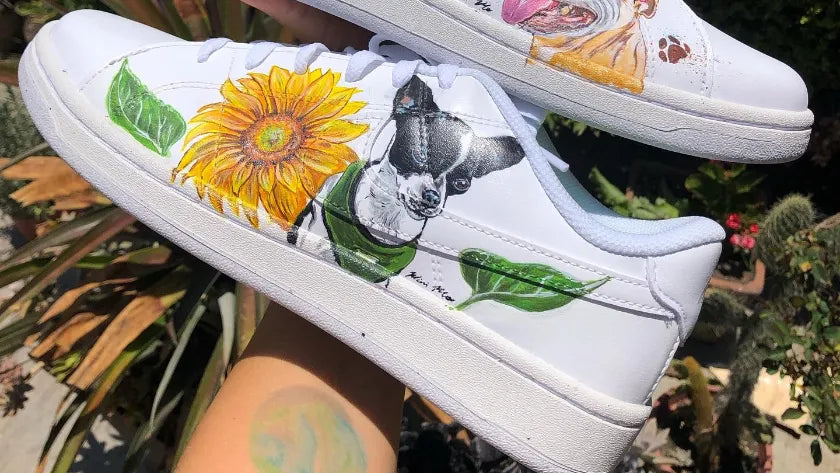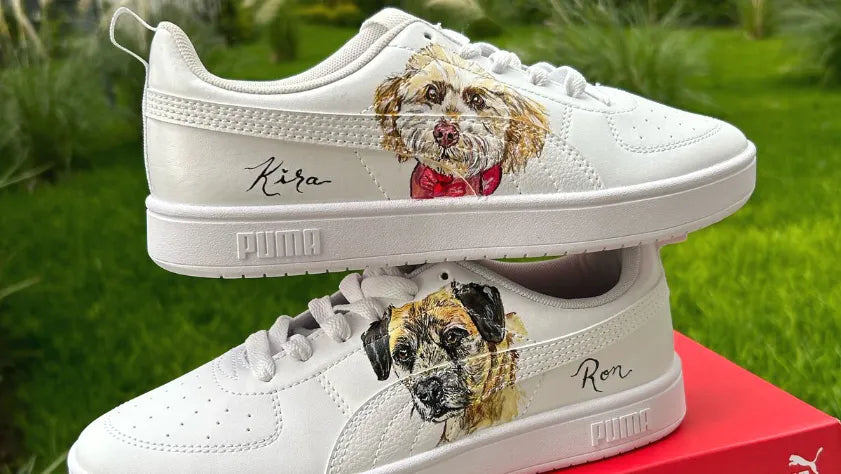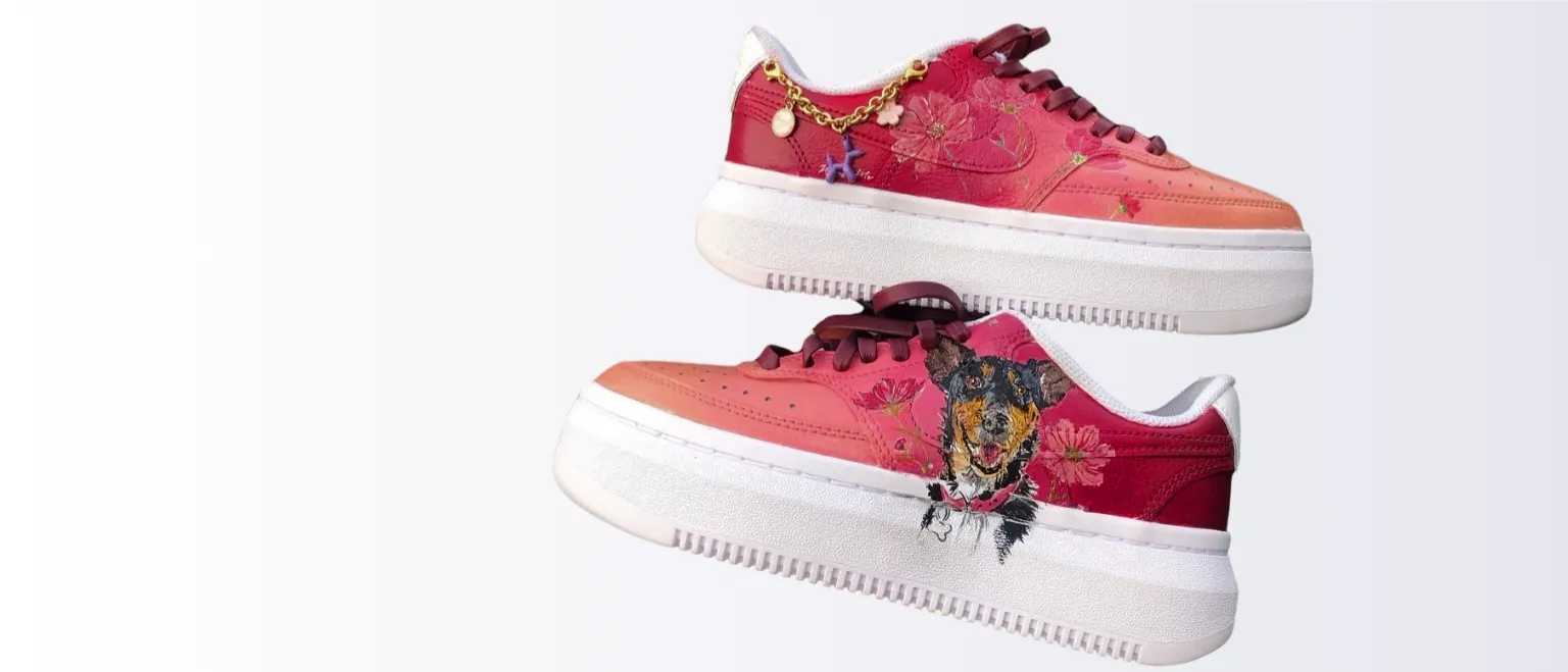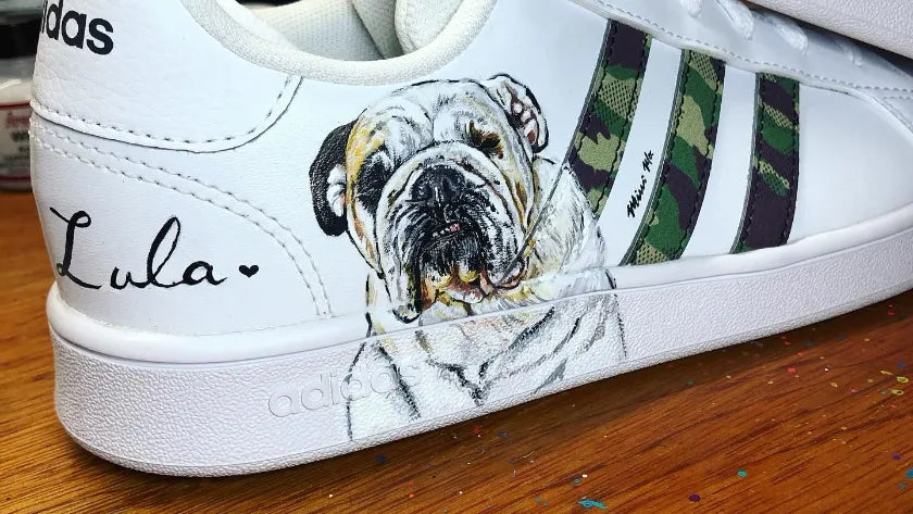 Inmortaliza a tu compañero más fiel con un retrato hecho a mano por nuestros artistas. Aplicado en calzado blanco (sneakers o botas) con tintas acrílicas duraderas y sellado para preservar los detalles.